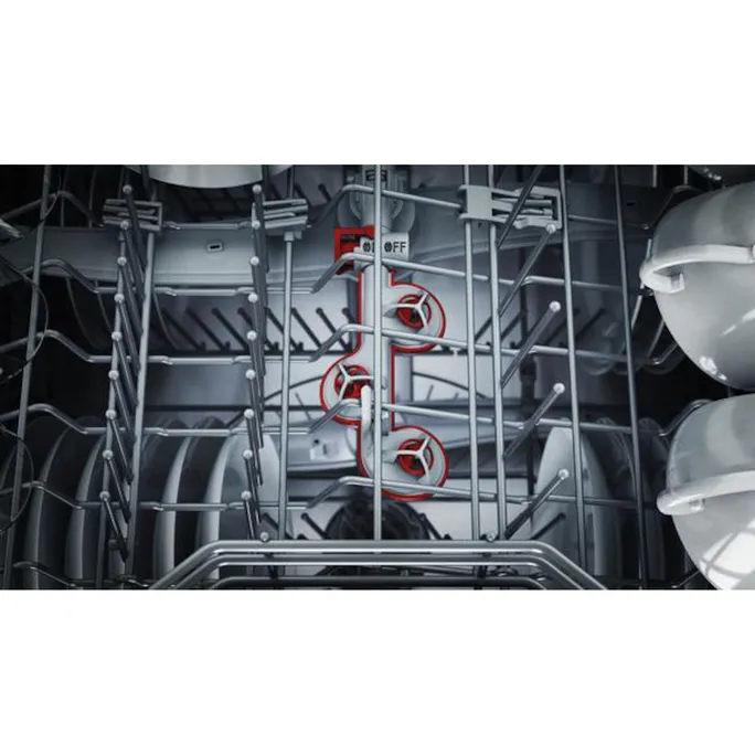 Der Oberkorb ist durch die 3-fach Rackmatik mit einem Griff um insgesamt 5 cm dreistufig höhenverstellbar. Und das sogar voll beladen. Ob Pizzateller oder langstielige Gläser – für hohes Spülgut wird so ganz flexibel oben oder unten noch mehr Platz geschaffen.