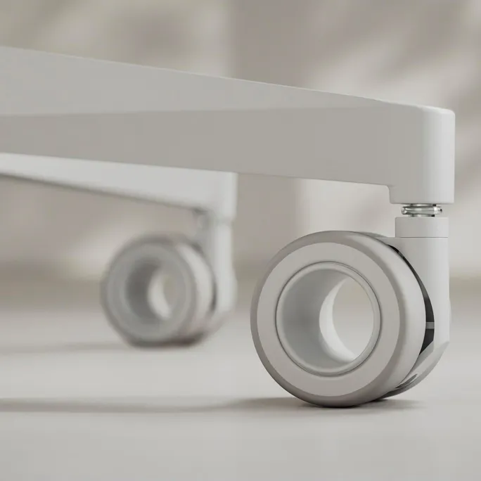 - Leichtgängige, nabenlose Rollen aus speziellem Material, das Stöße absorbiert, die Lautstärke reduziert und die Oberfläche des Bodens schont