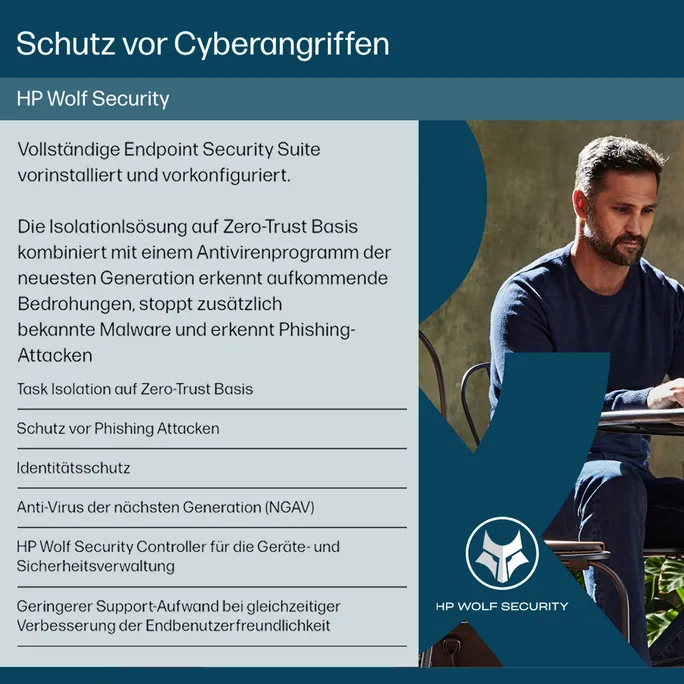 Durch HP Wolf Security geschützt: HP Wolf Security for Business bildet eine hardwaregestützte, durchgehend verfügbare und robuste Verteidigung. Vom BIOS bis hin zum Browser, oberhalb, innerhalb und unterhalb des Betriebssystems: Unsere Lösungen bilden einen starken Schutzwall und schützen Ihren PC vor modernen Bedrohungen.5
