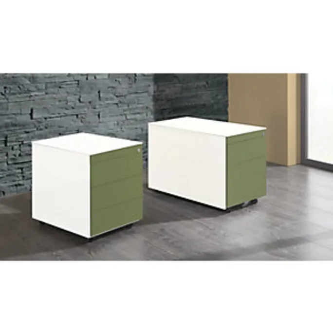 Schubladencontainer mit Rollen, HxT 570 x 600 mm, Stahlplatte, 3 Schubladen, reinweiß / schilfgrün / reinweiß. Anlieferung = montiert. Höhe = 570 mm. Breite = 417 mm. Tiefe = 600 mm. Utensilienschub = ja. Anzahl Materialschübe = 3 Stück. Auszug Materialschub = 75%. Innenmaße Materialschub HxBxT = 130x330x485 mm. Produkttyp = Rollcontainer. Material = Stahl, pulverbeschichtet. Korpusfarbe = reinweiß RAL 9010. Korpusstärke = 0.75 mm. Schubladenmaterial = Stahlblech. Schubladenfarbe = schilfgrün RAL 6013. Schubladentraglast = 18 kg. Schubladen-Anzahl/Größe = 3 Stk HxBxT 130x330x485 mm. Schubladenführung = mit kugelgelagerten Teleskopauszügen. Eigenschaft = verschließbar, Auszugsperre. Radausstattung = 4 Rollen, davon 2 feststellbar. Raddurchmesser = 35 mm. Plattenstärke = 10 mm. Hochwertige Schubladenführung mit Selbsteinzug und Dämpfung. Alle Ausführungen mit Utensilienschub. Materialschübe 75%, Hängeregistraturen 100% ausziehbar. Schubladen mit Griffrinnen auf beiden Seiten und geschlossenem Boden. Hochwertige Führungen mit Selbsteinzug und Dämpfung. Auszugssperre und Drehzylinderschloss, verschiedenschließend. Stabiler, verschweißter Stahlblechkorpus mit hochwertiger Einbrennlackierung. Rollcontainer mit Abdeckplatte aus Stahl. Materialschübe 80% ausziehbar. Montierte Anlieferung.